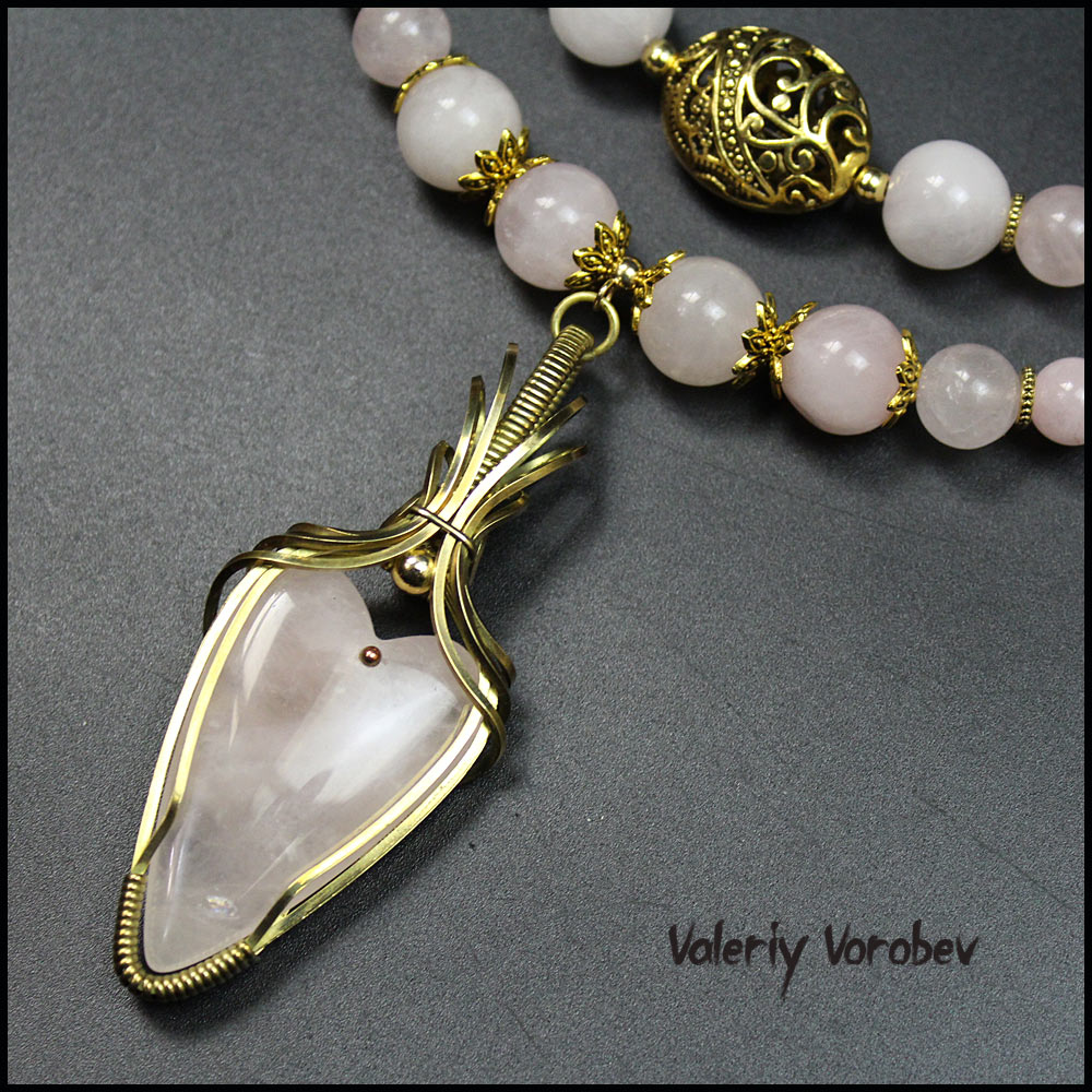 Кулон ручной работы из розового кварца и проволоки из латуни. Автор: Валерий Воробьев. Есть мастер класс.