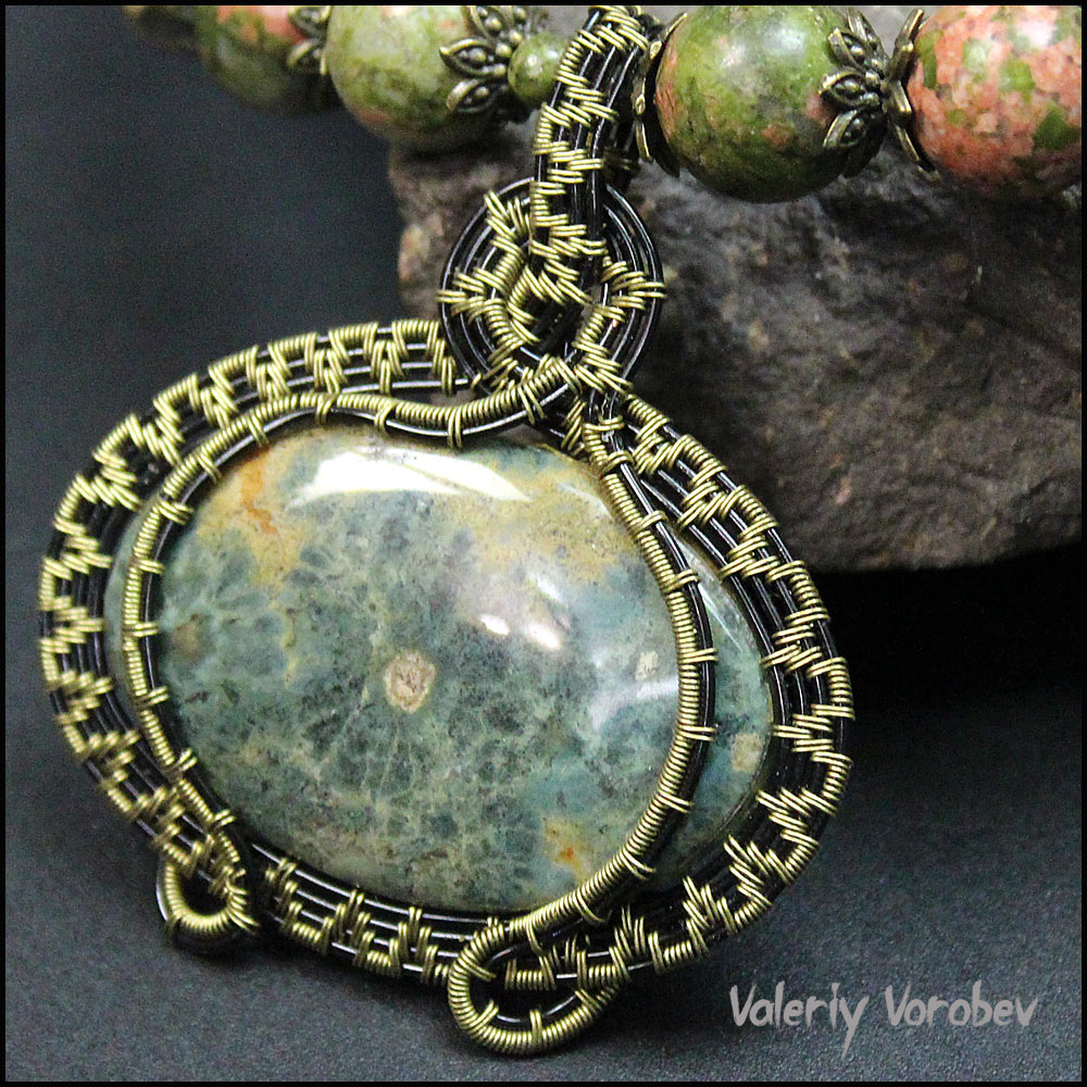 Кулон ручной работы из цветной проволоки и окаменелого коралла. Автор: Валерий Воробьев.